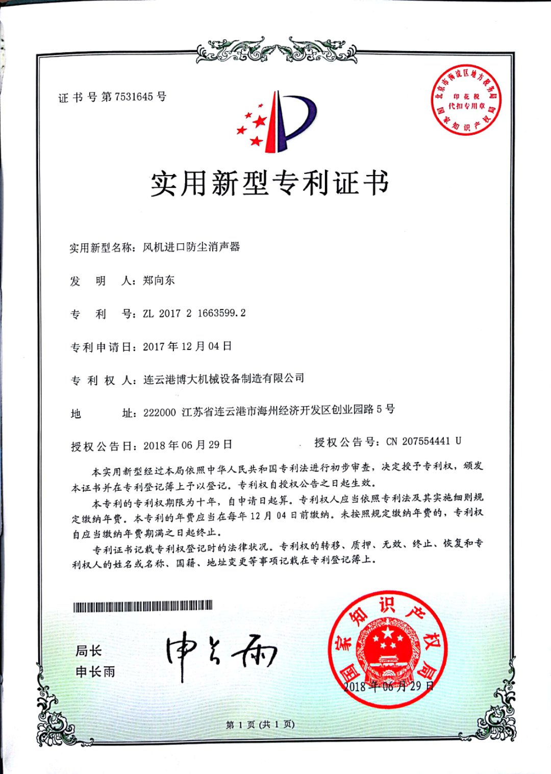 風機進口防塵消聲器 專利證書